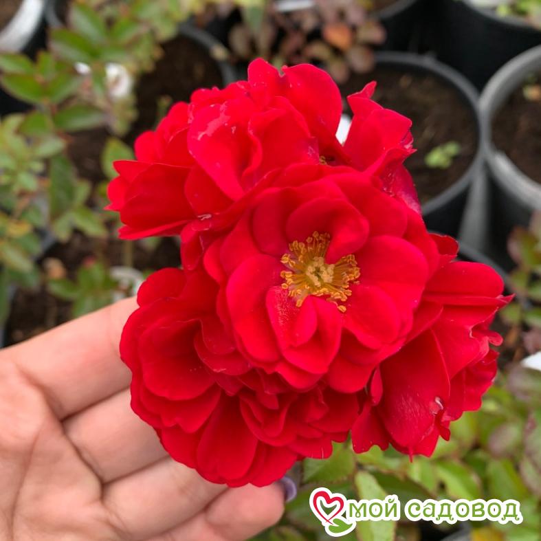 Это выносливый сорт розы, многие заболевания и морозы до 30 градусов не нанесут ей вреда. На побегах появляются густомахровые цветы красного цвета, 5-6 см диаметром, соцветия появляются непрерывно в течение периода июнь-октябрь. Растения источают еле слышный нежный аромат. К концу цветения формирующихся соцветий меняется, становясь насыщенно-вишневым.