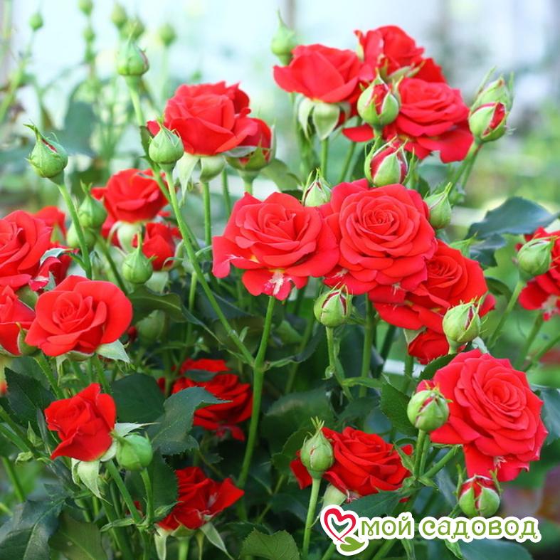 Роза спрей Мирабель Это сорт голландской селекции (фирма Интерплант). Мирабель – роскошная представительница группы спрей. Заполучить уникальную розу мечтают многие ценители и просто садоводы-любители. Она вынослива, неприхотлива и обладает высокими декоративными качествами. Ботаническое описание Сама характеристика данного вида свидетельствует об обильноцветущем растении, усыпанном многочисленными мелкими цветками. Роза Мирабель представляет собой прямостоячий кустарник компактных размеров. Максимальная его высота достигает – 50 – 70 см. Побеги крепкие, увенчанные изящными удлинёнными соцветиями. Диаметр раскрывшихся бутонов равен 3 – 4 см. Форма у них бокаловидная. Цвет отличается чистотой и насыщенностью. Роза, как и на фото каталога, ярко-красного цвета. Лепестки имеют лёгкую «подложку» в белых тонах. В одном соцветии насчитывается около 40 бутонов. Аромат в саду еле уловим. Цветение непрерывное в течение всего сезона. Начинается этот период с последних чисел июня и длится вплоть до начала заморозков. Применение Сфера применения сорта Мирабель достаточно широкая. В саду многолетник используется для оформления клумб. Он отлично сочетается как с сортами роз-спрей, так и с другими видами цветов. Классический красный окрас лепестков гармонично смотрится в окружении белых, розовых и оранжевых соцветий. Также кустики подойдут для оформления балконов, бордюров и террас. Миниатюрные розочки придают особый шарм архитектурным композициям. Сорт Мирабель активно используется и во флористике. Нераскрывшиеся бутоны добавляют в бутоньерки и букеты невест. Также цветочками декорируют праздничные столы, фотозоны и прочие уголки помещений, предназначенных для торжественных мероприятий. Следует отметить, что розы-спрей хорошо проявляют себя в срезке – в вазе они стоят до 2 недель. Агротехника Выращивание розы Мирабель не составит труда, если использовать рассаду из хорошего питомника. Именно такой посадочный материал предоставляет магазин Садовод. Место для многолетника выбирают освещённое и закрытое от холодных сквозняков. После переноса в открытый грунт молодым растениям нужен качественный уход. Отменные внешние качества розы помогут поддержать: своевременные поливы; регулярные подкормки; удаление сорняков; укрытие саженцев на зиму (без утепления роза может выдержать непродолжительные морозы до -17 ˚С). Самую большую угрозу розе Мирабель представляет тля. Колонии насекомого поселяются на внутренней части листвы. Питаются они соком растения, что провоцирует скручивание и увядание листовых пластин. Размножается тля быстрыми темпами (в год до 10 поколений). Для борьбы с вредителем применяется мыльный раствор с горчичным порошком. Если ситуация не изменилась в лучшую сторону, в ход идут химические препараты (например, Рогор, Актелик и Карбофос). Иногда при неправильной агротехнике розу Мирабель атакует паутинный клещ. Насекомое повреждает тыльную сторону листьев. Как и тля, оно высасывает соки из растения, что приводит к образованию жёлтых пятен. Со временем кустарник теряет декоративный вид. Выявить клеща можно по тонким паутинкам, переплетающимся между листиками. Уничтожить врага помогут химические препараты Фитоверм или типа Вермитек. Из заболеваний в редких случаях роза-спрей поражается мучнистой росой. О проб